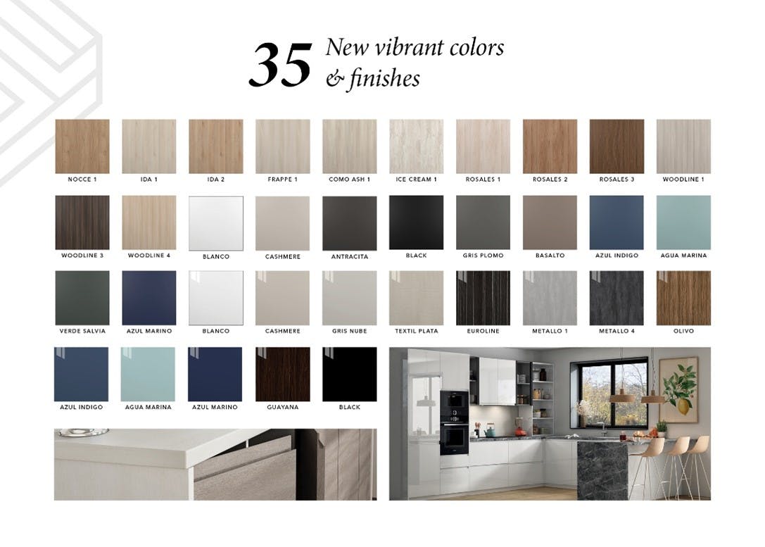 We are always expanding our product range to offer you the latest styles, colors, and customization options. Our Illume Designer Collection features 35 new and vibrant colors and finishes. These colors and finishes, available in textured, matte, and high-gloss, are based on popular and high-demand accents often used in kitchens. With these new options, you will have even more choices to create a unique kitchen design.