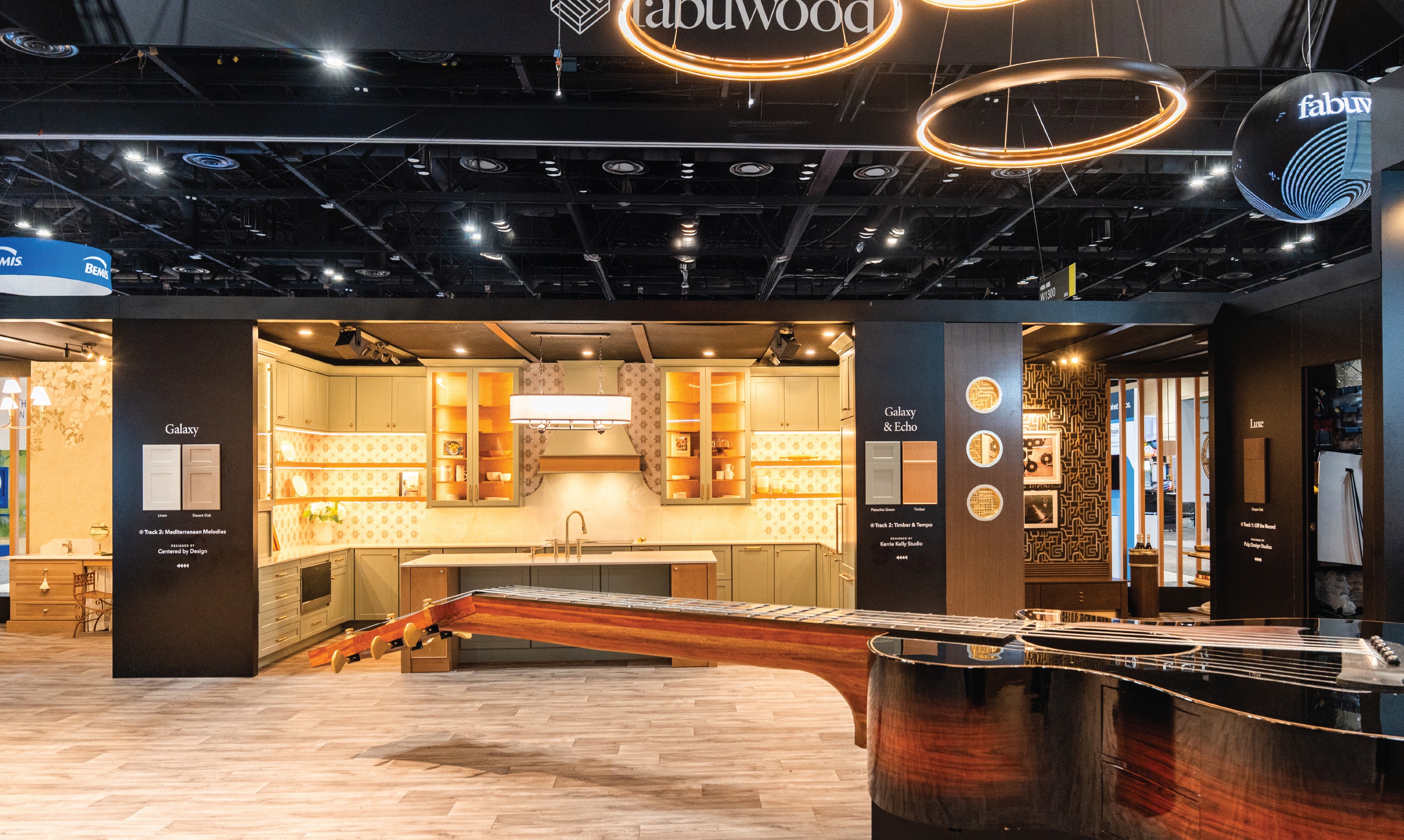 Standing at the heart of the booth was the true pulse of the display: a massive, handcrafted wooden guitar. This wasn't just a prop; it was a labor of love by David Eigner, an inhouse craftsman, who worked tirelessly for months to bring it to life. Finished with a high-gloss luster that mirrored the reflective depth of our premium cabinetry, it left the crowd wowed. It served as the perfect symbol for Fabuwood, precision engineering meeting a soulful, artistic core.