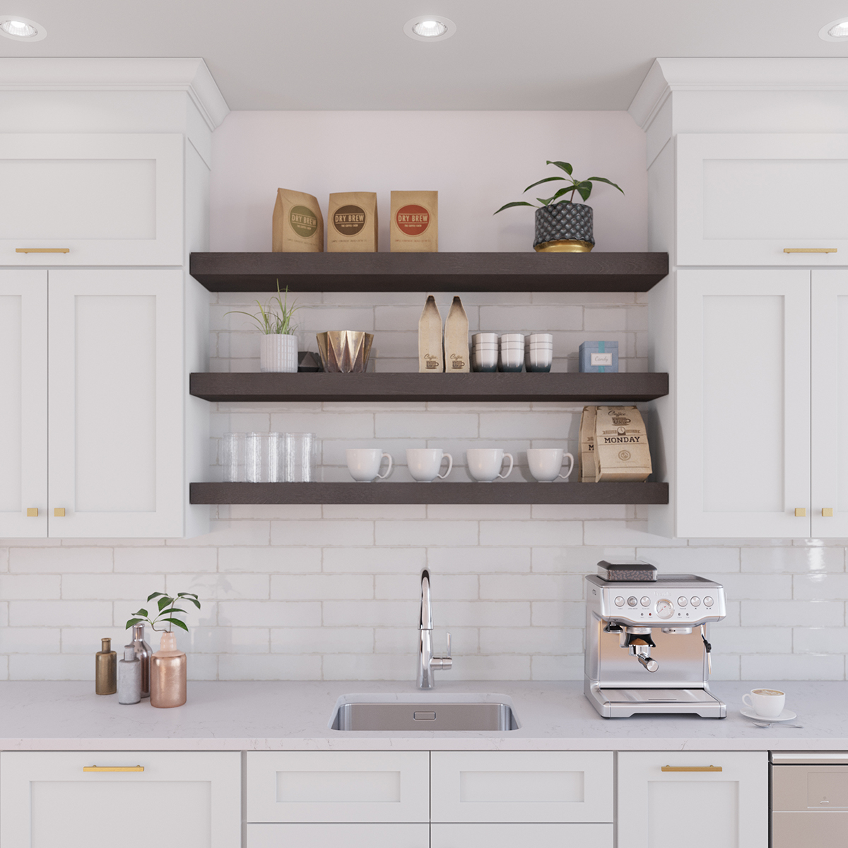 Allure shelves are crafted from thick veneered plywood with matching edge banding for durability and a cohesive interior look. Fully adjustable shelving allows flexible storage across wall, base, and tall cabinetry.