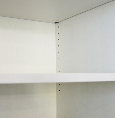 Illume shelves are constructed from thick engineered furniture board with White Linen textured laminate and matching edge banding. Fully adjustable shelving supported by metal clips provides lightweight strength and consistent interior styling.