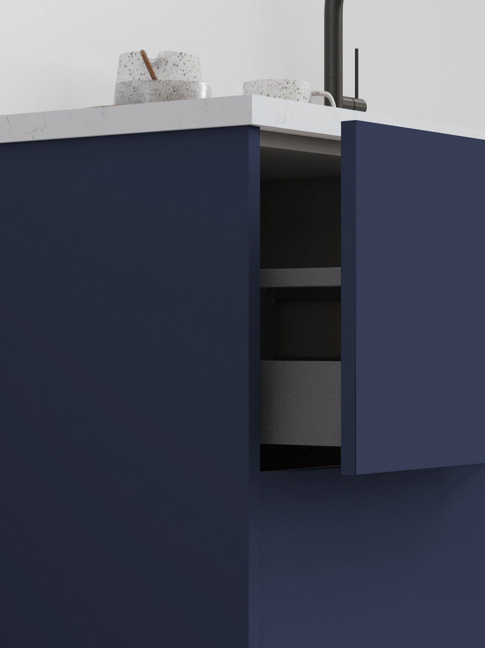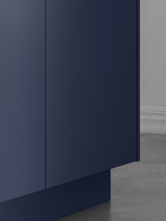 Azul Marino’s deep navy tones and smooth matte exude calm confidence and timeless elegance. They perfectly complement Catalina’s simple slab-style doors, creating a bold masterpiece in your home.