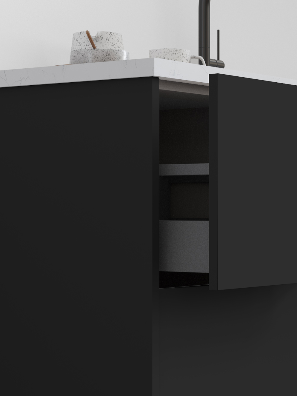 Paired with Catalina’s sleek, minimalist slab doors, Black’s rich, dramatic hue and smooth matte finish create a dramatic, head-turning space as sharp as your style.