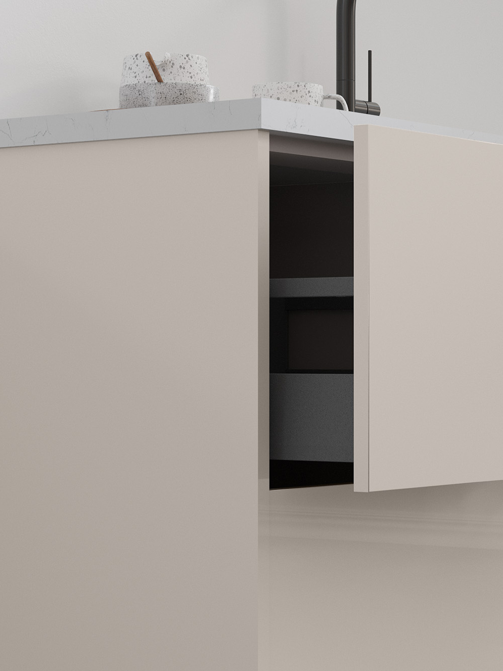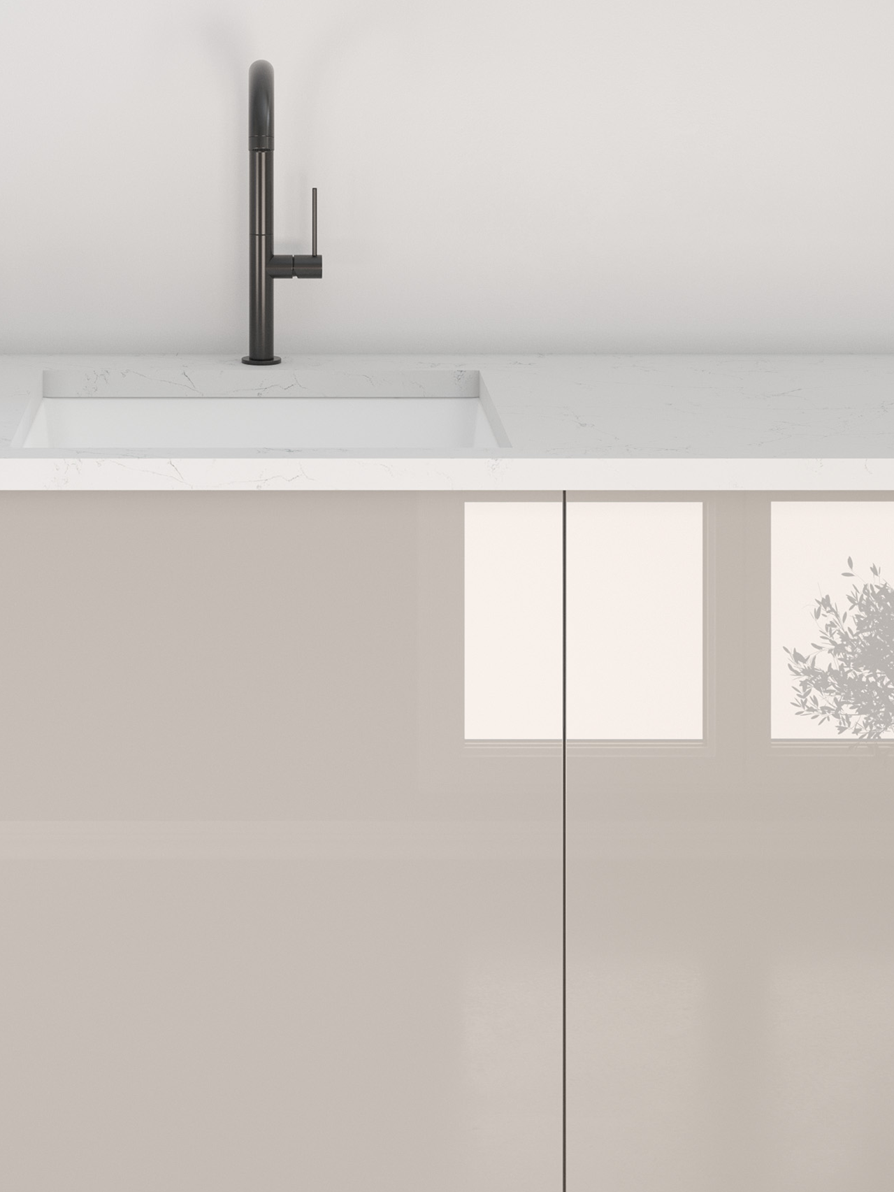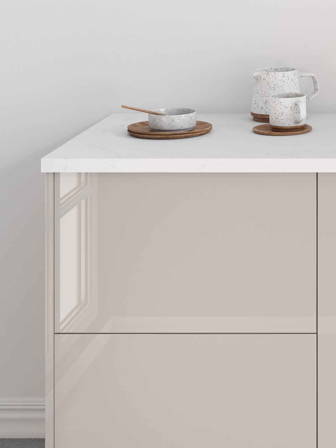 With its creamy beige tone, soft champagne undertones, and sleek gloss finish, Cashmere pairs beautifully with Catalina’s minimalist slab doors. You’ll love the warm, inviting glow it brings to your space.