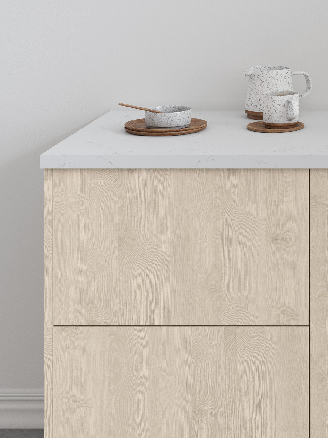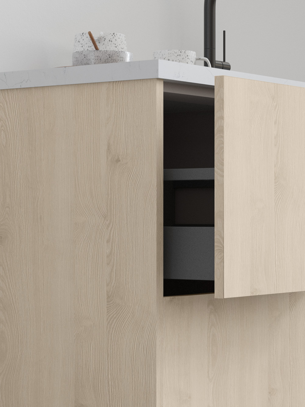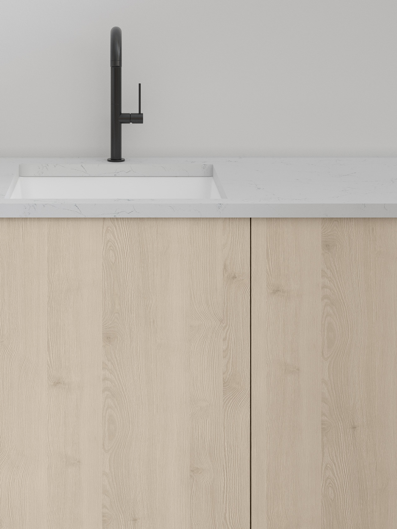 Catalina’s sleek design pairs effortlessly with Ida 1’s soft blend of light oak and sun-bleached beige, creating a space that feels both grounded and refreshingly open.