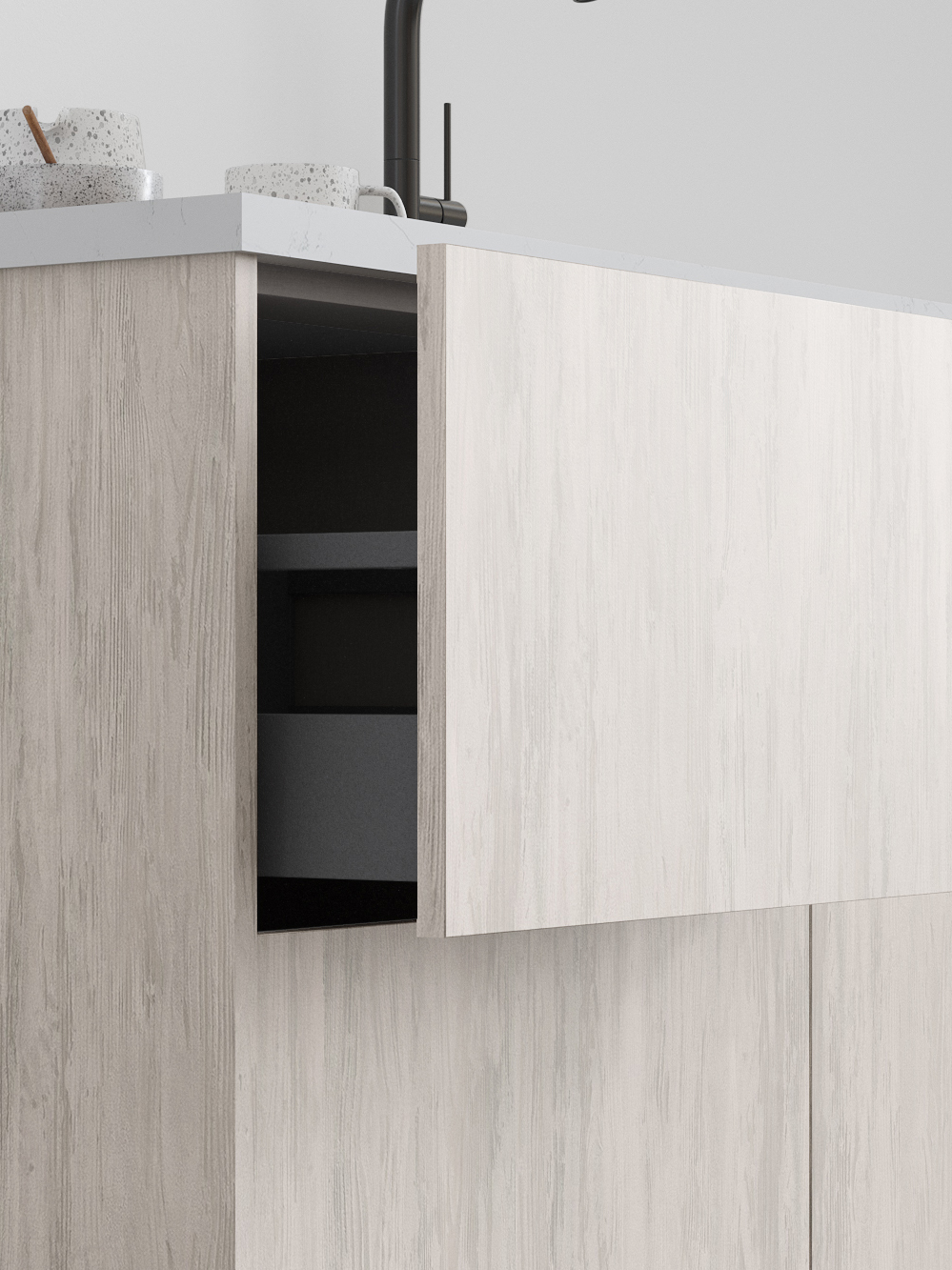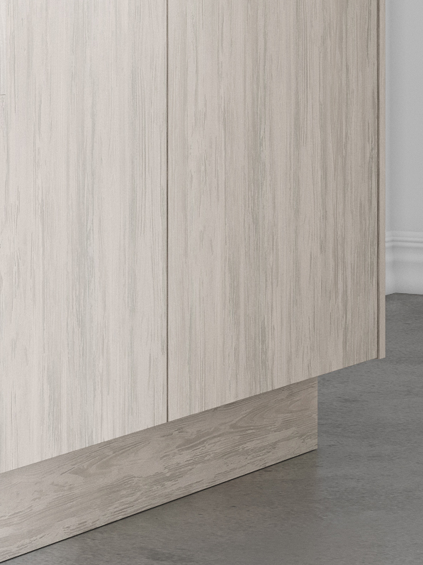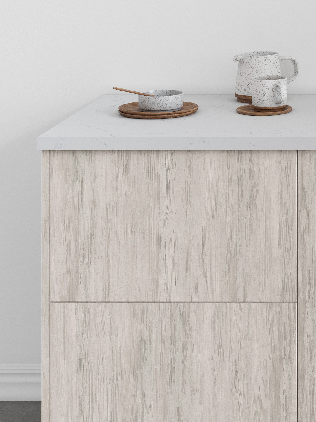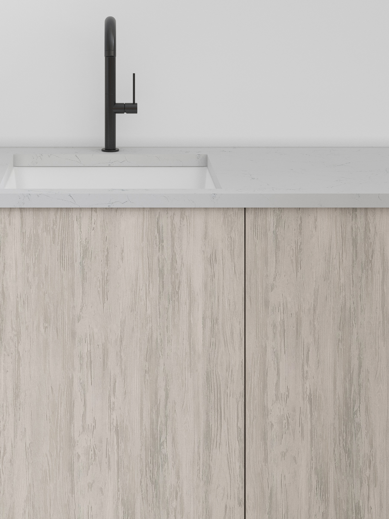 Catalina’s clean-lined door features Light Artwood’s pale, washed finish, with soft beige tones, subtle gray streaking, and a lightly brushed look.