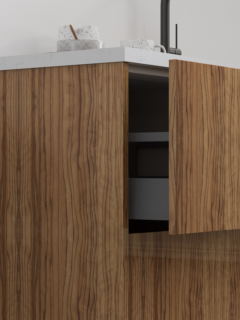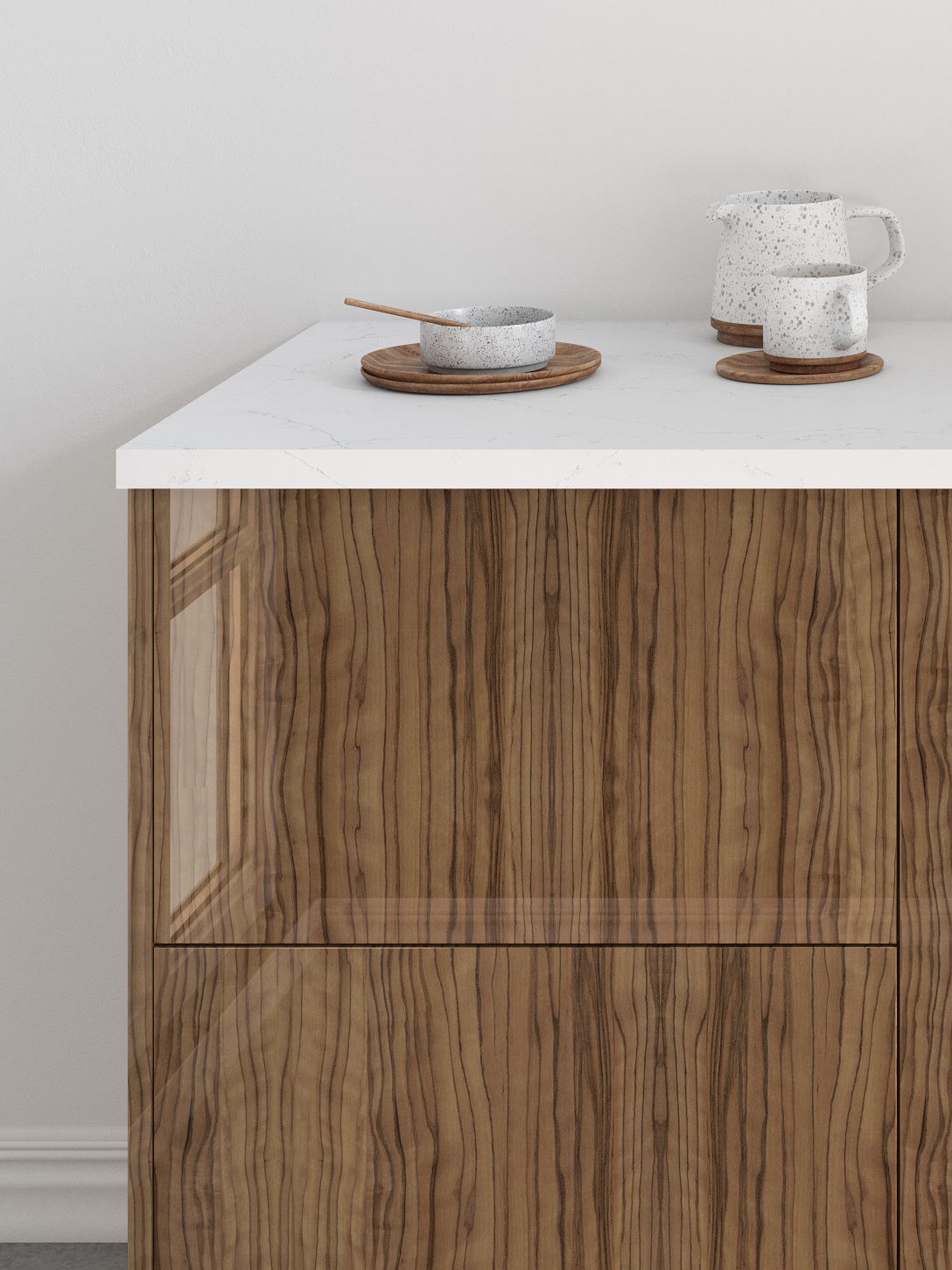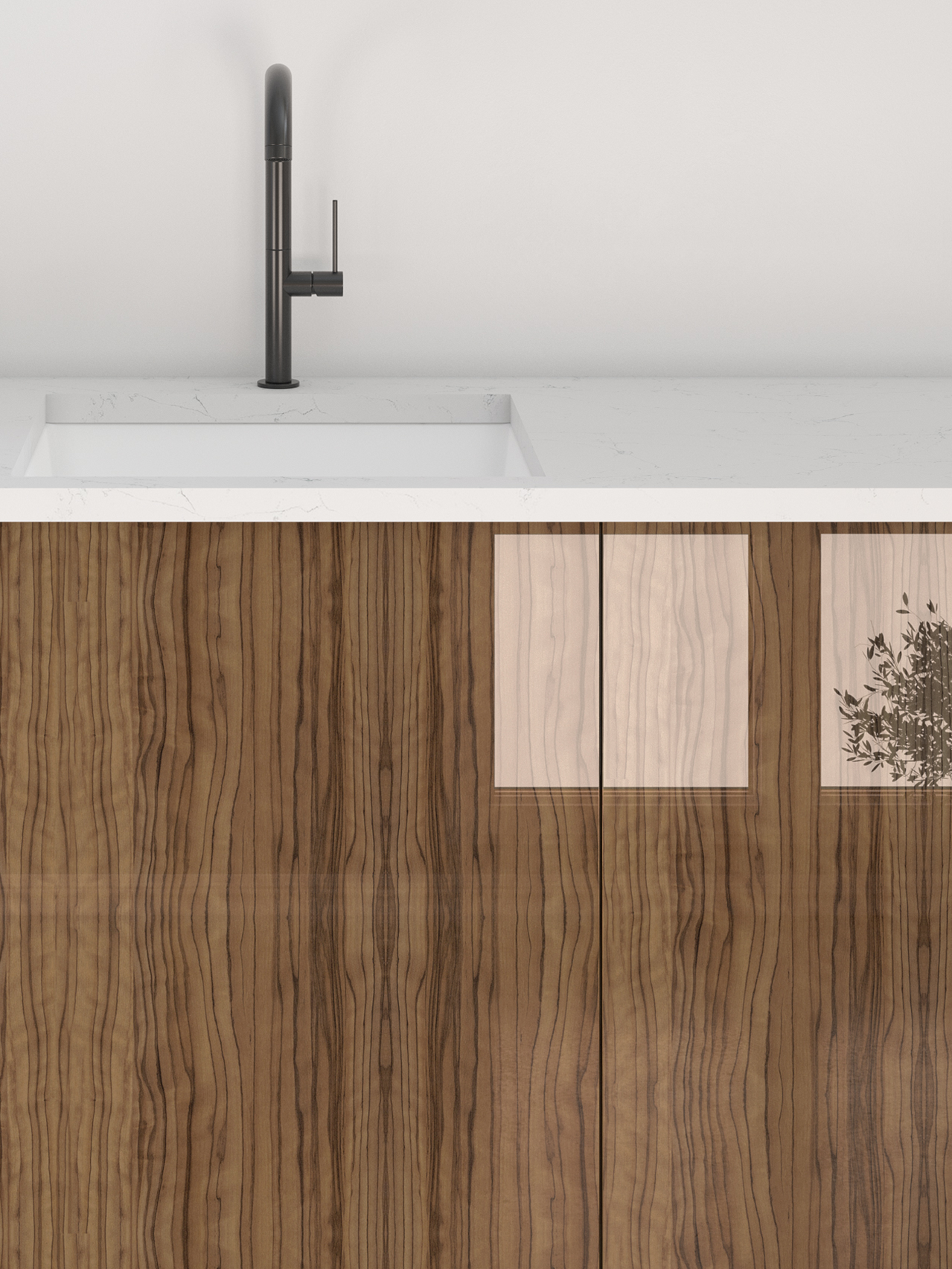 Olivo's warm, naturally stunning beauty shines with Catalina’s simple slab style. The rich tones and intricate grain patterns are full of character and will come to life in your home.