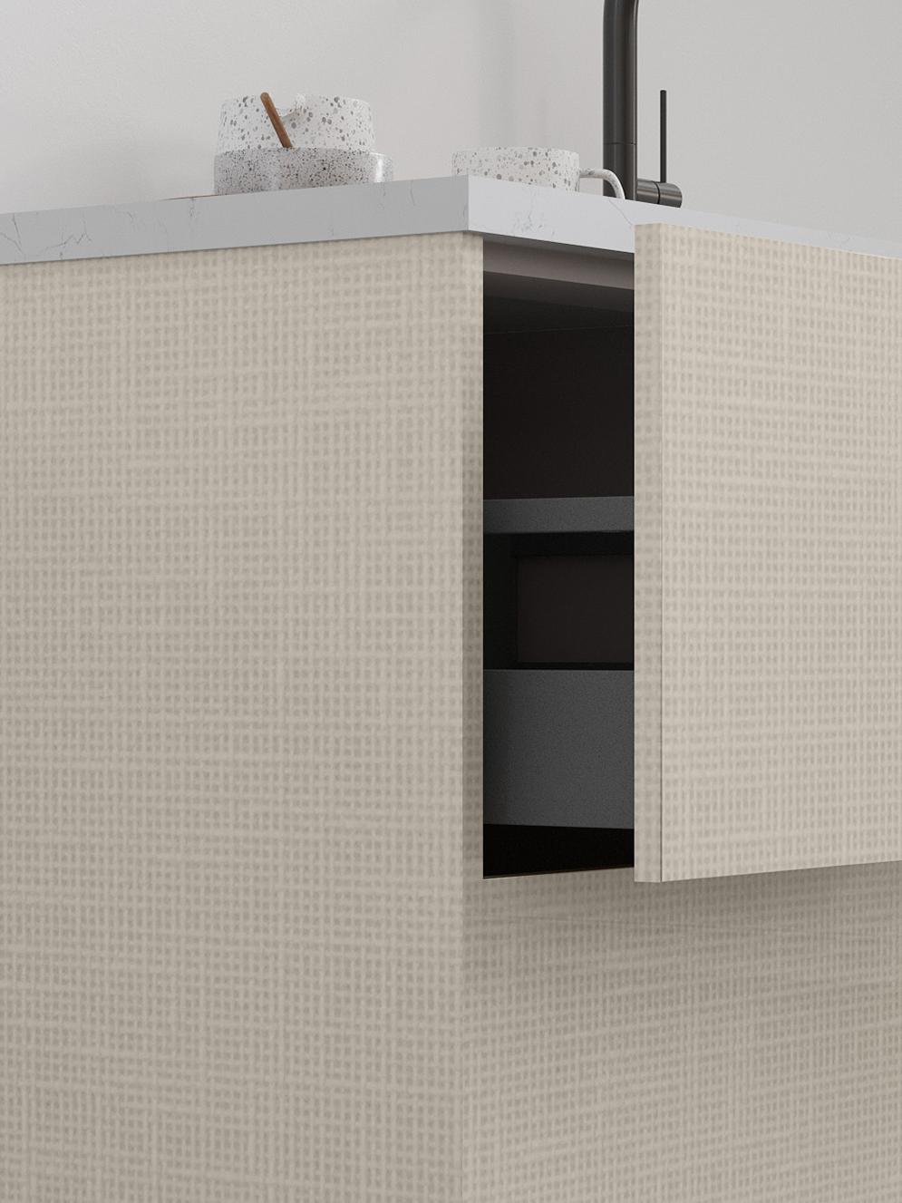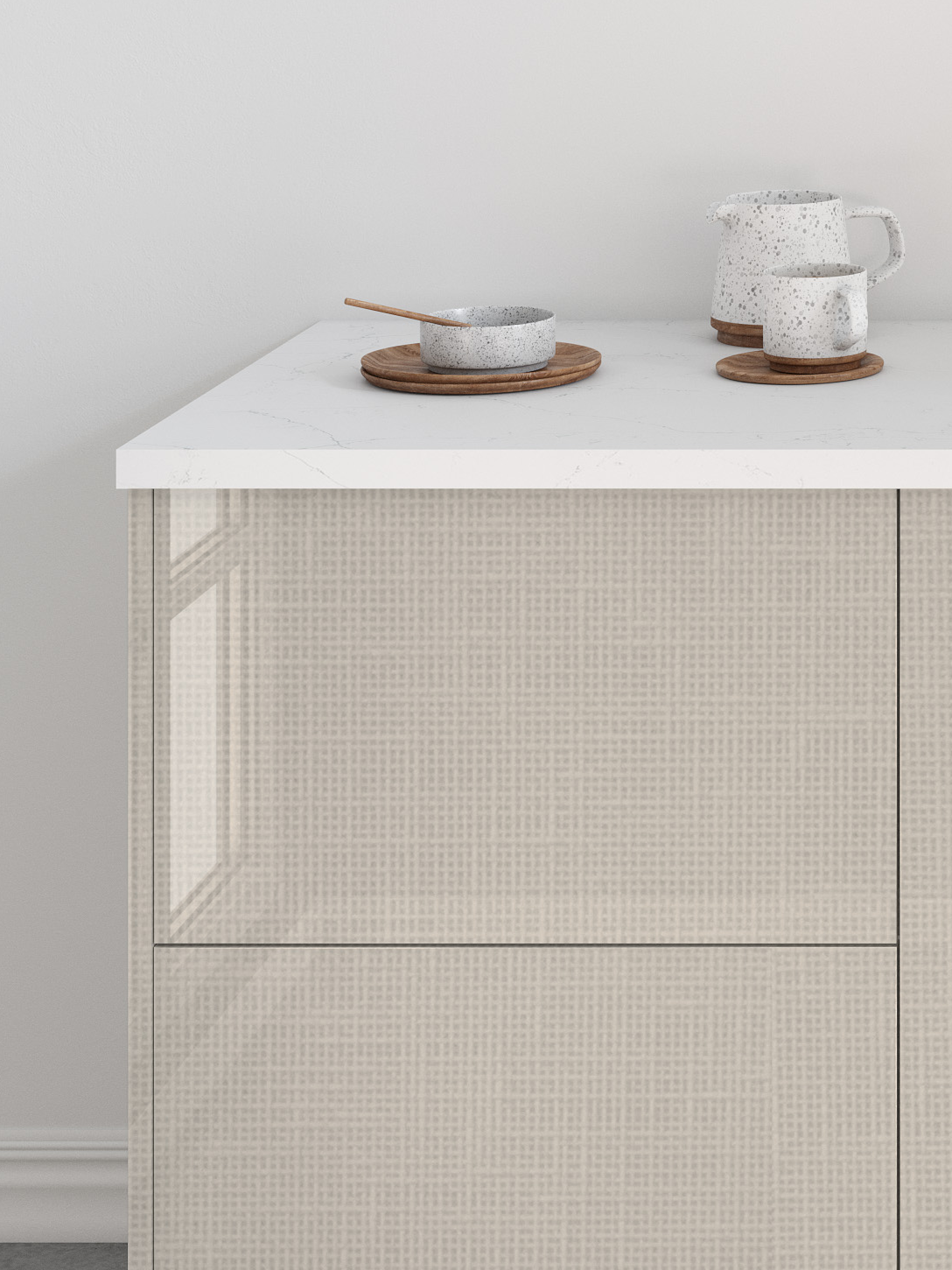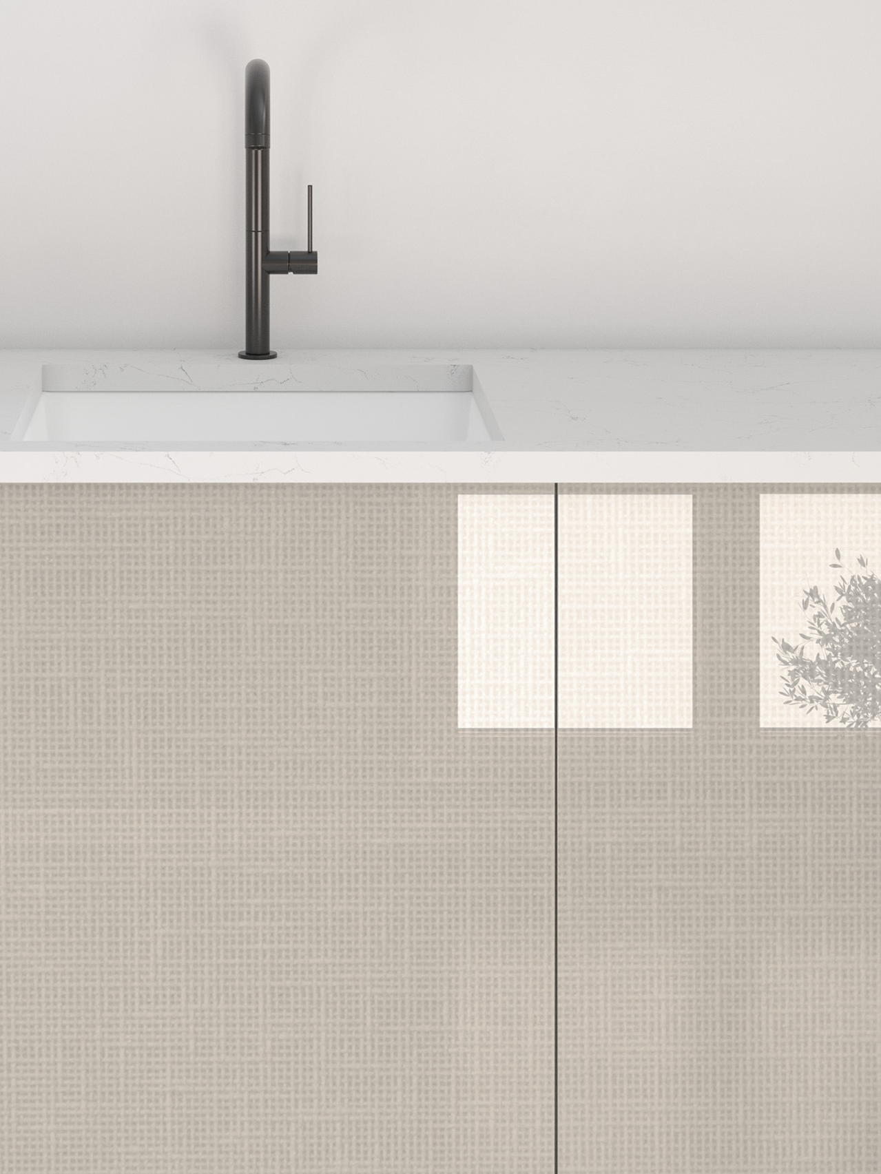 Catalina’s sleek, minimalist slab doors beautifully complement the soft sophistication of Textil Plata. You’ll love its silver-gray hues, woven with subtle fabric-like detailing, and the depth it brings to your space.