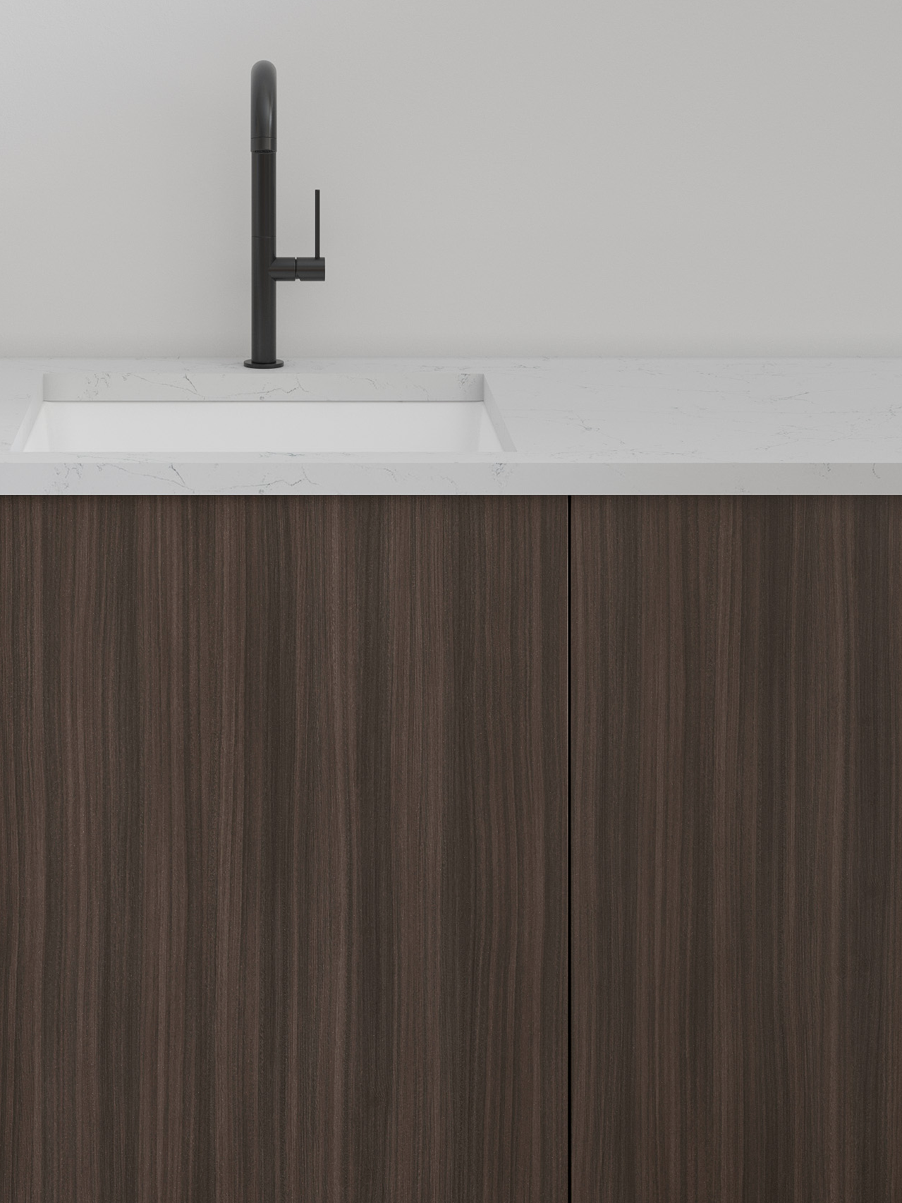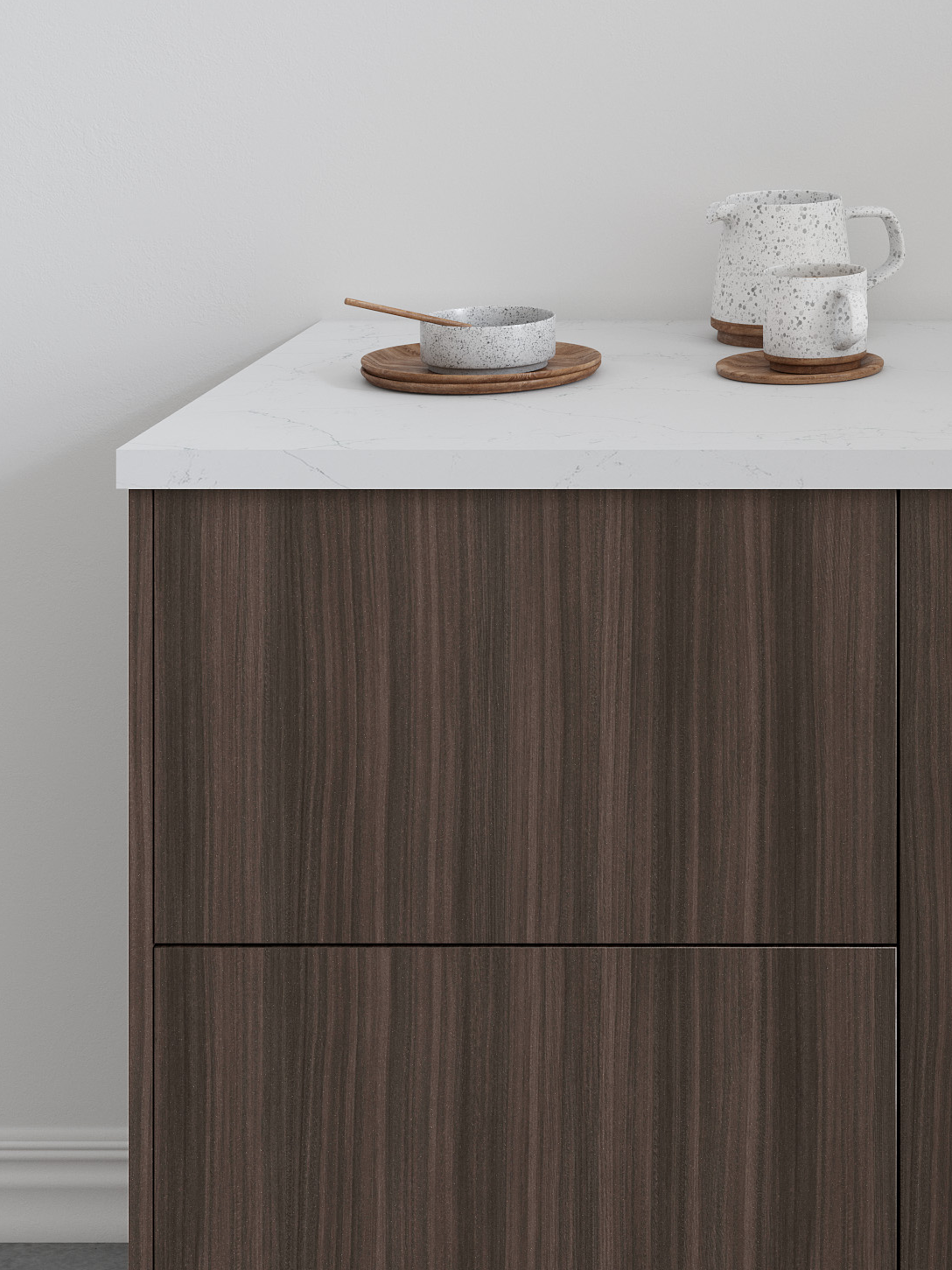 With its rich blend of espresso and dark walnut tones, Woodline 3 brings the warm ambiance of a cozy library modernized by the sleek and minimalist Catalina door style.
