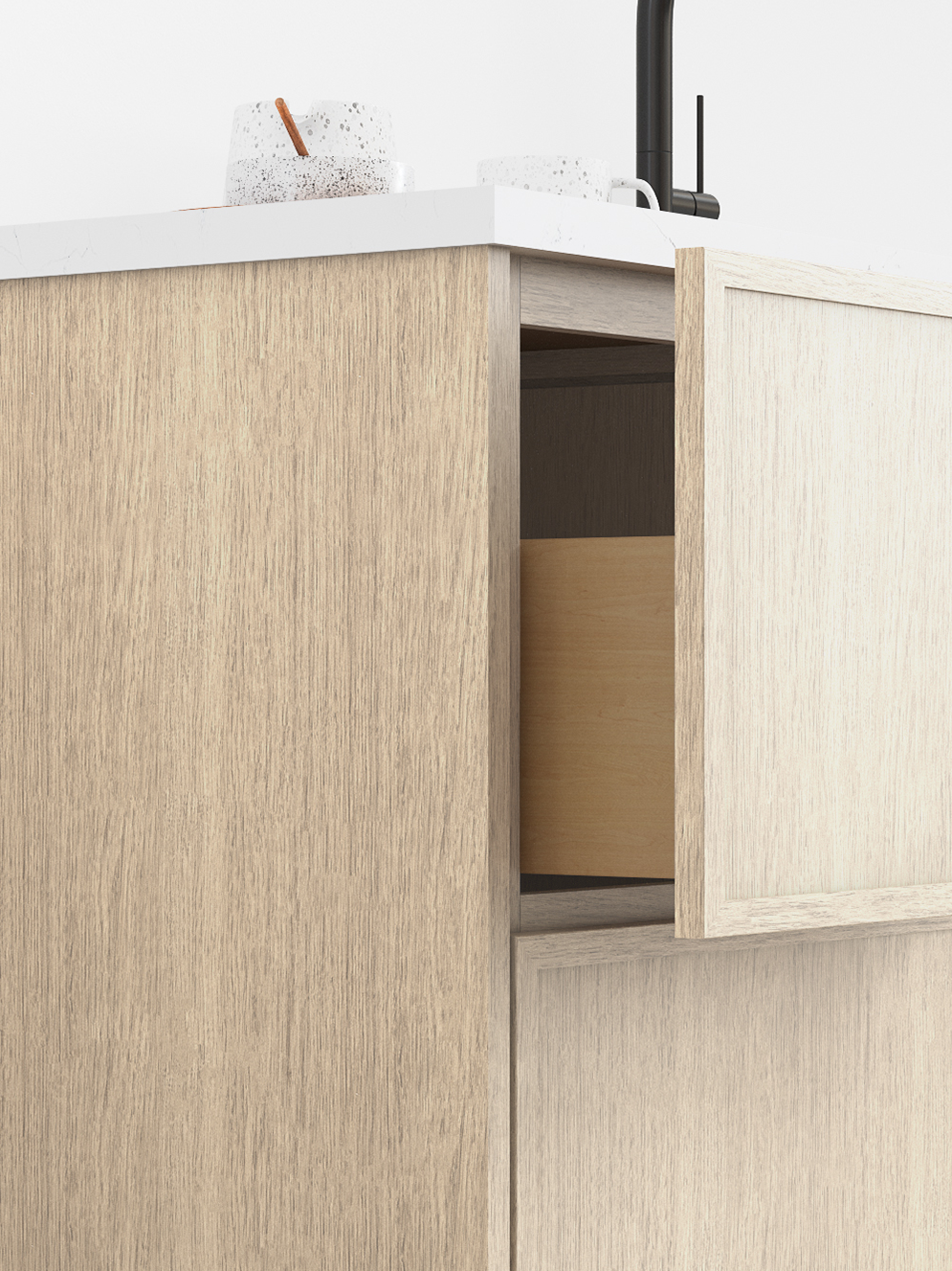 Luna’s slim lines paired with Desert Oak’s natural white oak finish bring understated refinement to your space. Its soft streaking adds texture and personality to the clean grain, creating a serene, modern kitchen designed for effortless living.