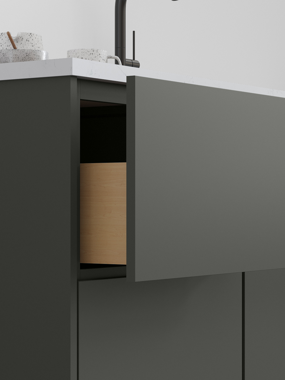 Luxe’s smooth wood-veneer styling and streamlined form deliver a sophisticated, contemporary aesthetic. Its subtle grain and minimalist silhouette bring a sense of elevated calm to kitchens designed for modern living.