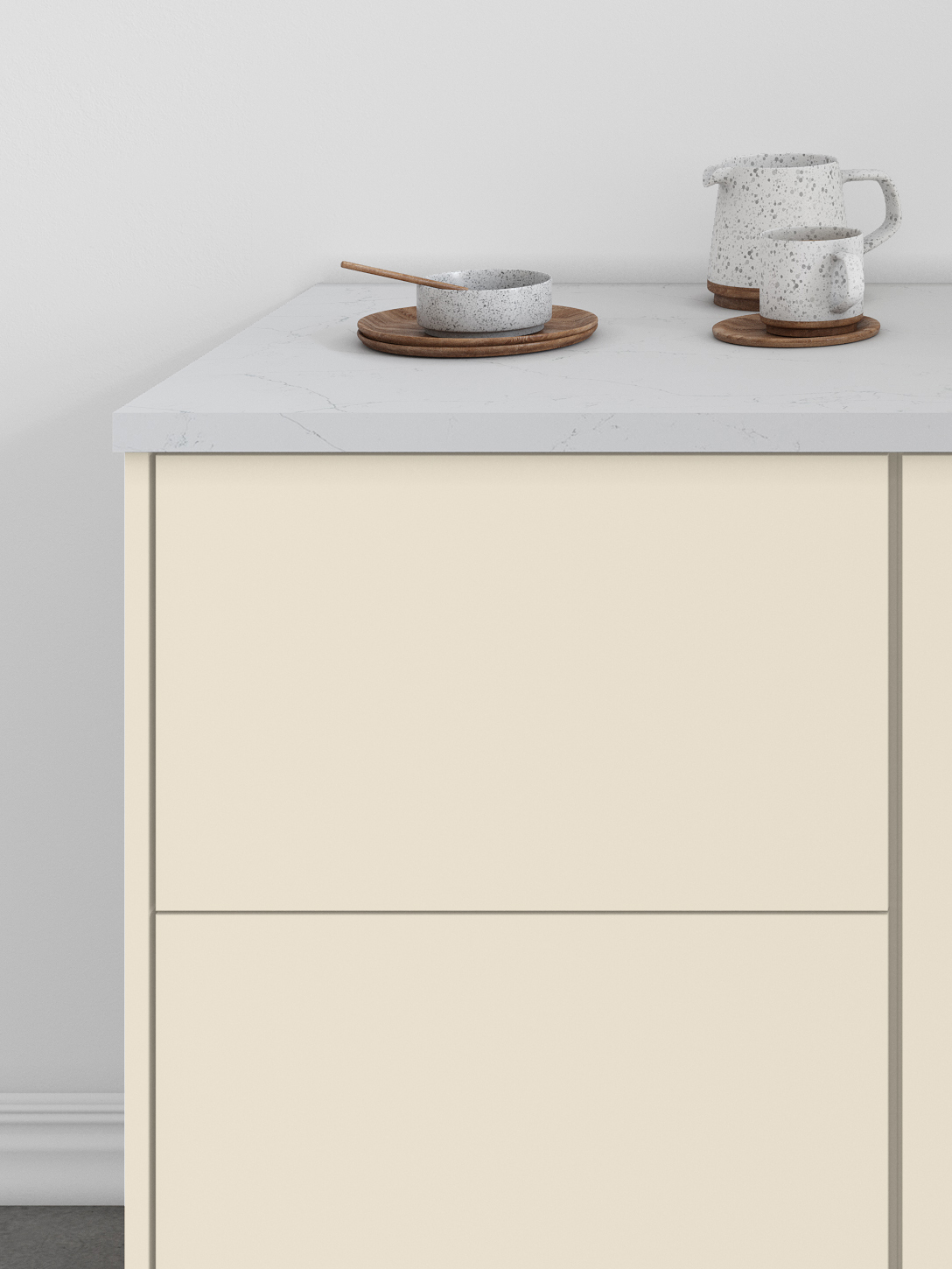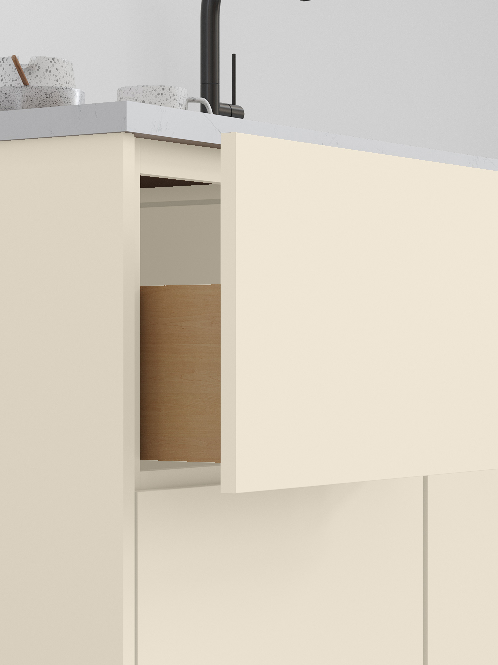 Luxe’s smooth wood-veneer styling and streamlined form deliver a sophisticated, contemporary aesthetic. Its subtle grain and minimalist silhouette bring a sense of elevated calm to kitchens designed for modern living.