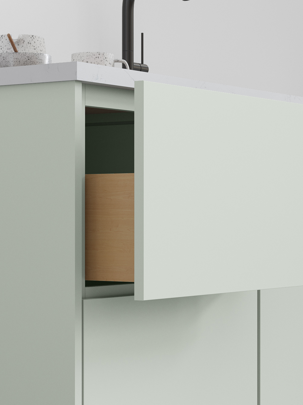 Luxe’s smooth wood-veneer styling and streamlined form deliver a sophisticated, contemporary aesthetic. Its subtle grain and minimalist silhouette bring a sense of elevated calm to kitchens designed for modern living.