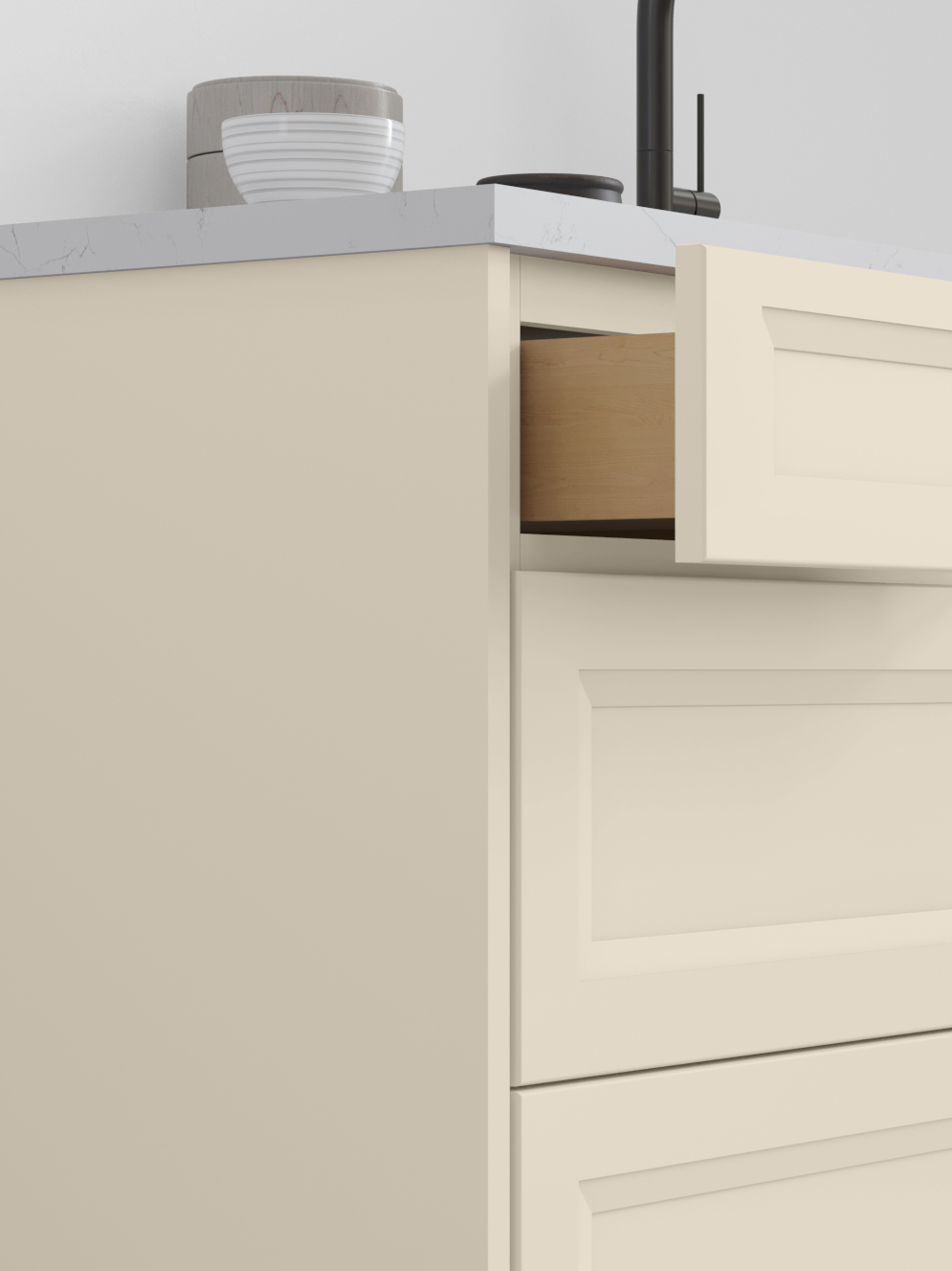 Linen’s creamy softness softens Onyx’s structured shaker look- creating a light, airy space that’s welcoming and endlessly versatile.