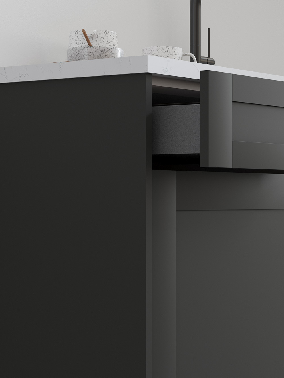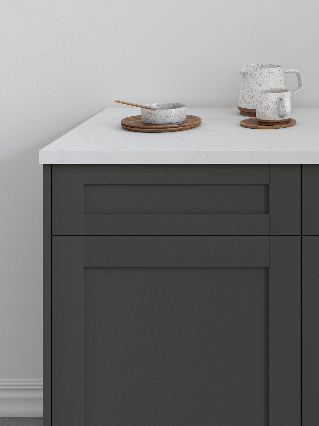 Tuscany’s modern shaker doors match Antracita’s deep, rich tones of charcoal, smoky graphite, and soft ash. You’ll love how the smooth matte finish absorbs light, making your space a modern masterpiece.