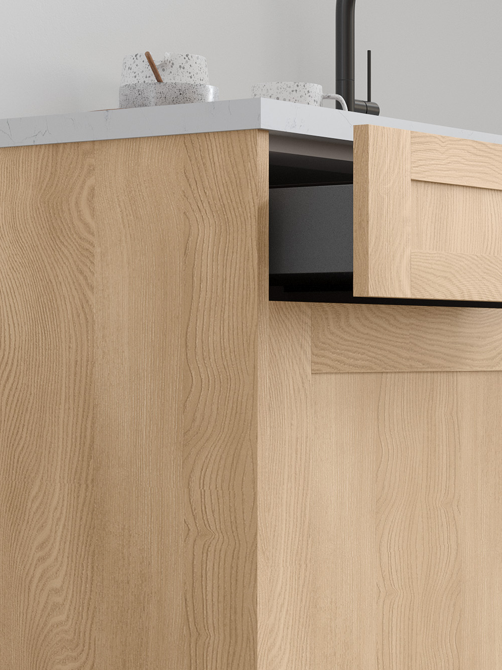 Tuscany’s modern, structured frame pairs beautifully with Como Ash 2’s light, wood-like grain, and sandy undertones, creating a warm, inviting, and refreshingly modern space.