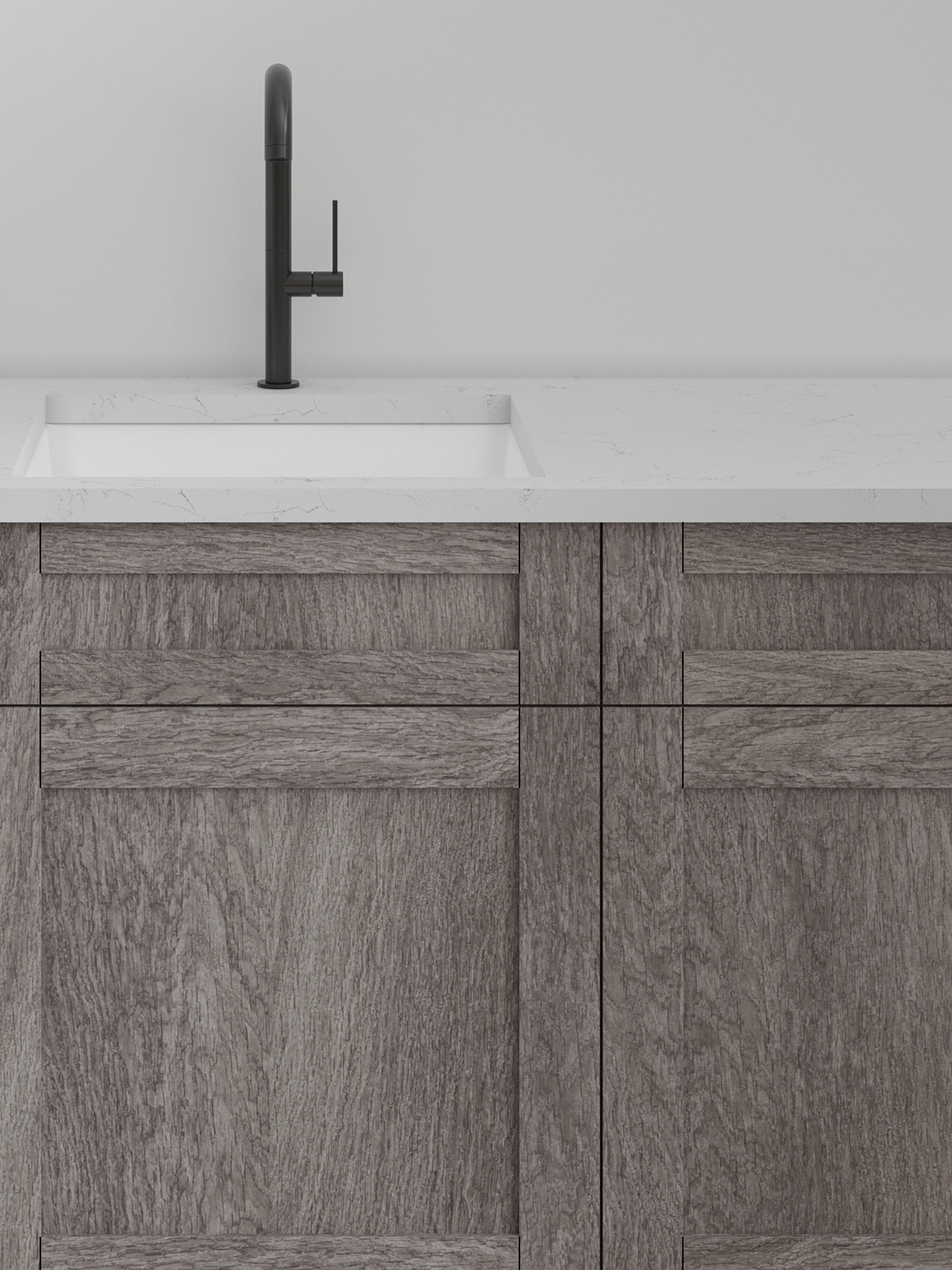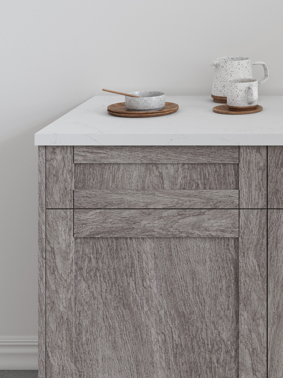 Muratti 1’s muted, cool-toned gray and taupe-like undertones, paired with Tuscany’s clean recessed panels and structured frame, create a contemporary space that feels perfectly balanced.