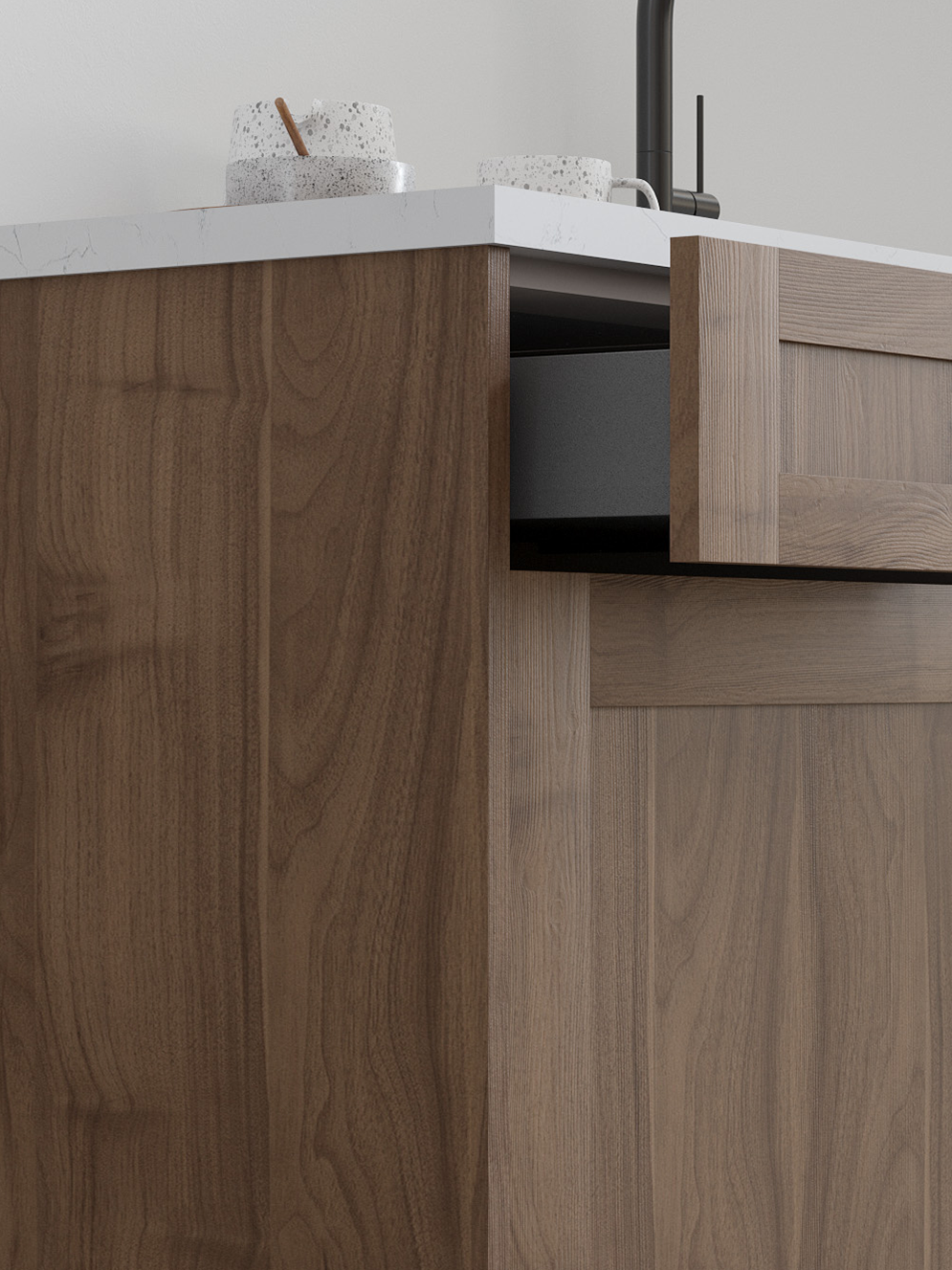 Nocce 3’s medium-toned brown and bold woodgrain pair beautifully with Tuscany’s modern recessed panels, bridging contemporary and traditional styles for welcoming character in your home.