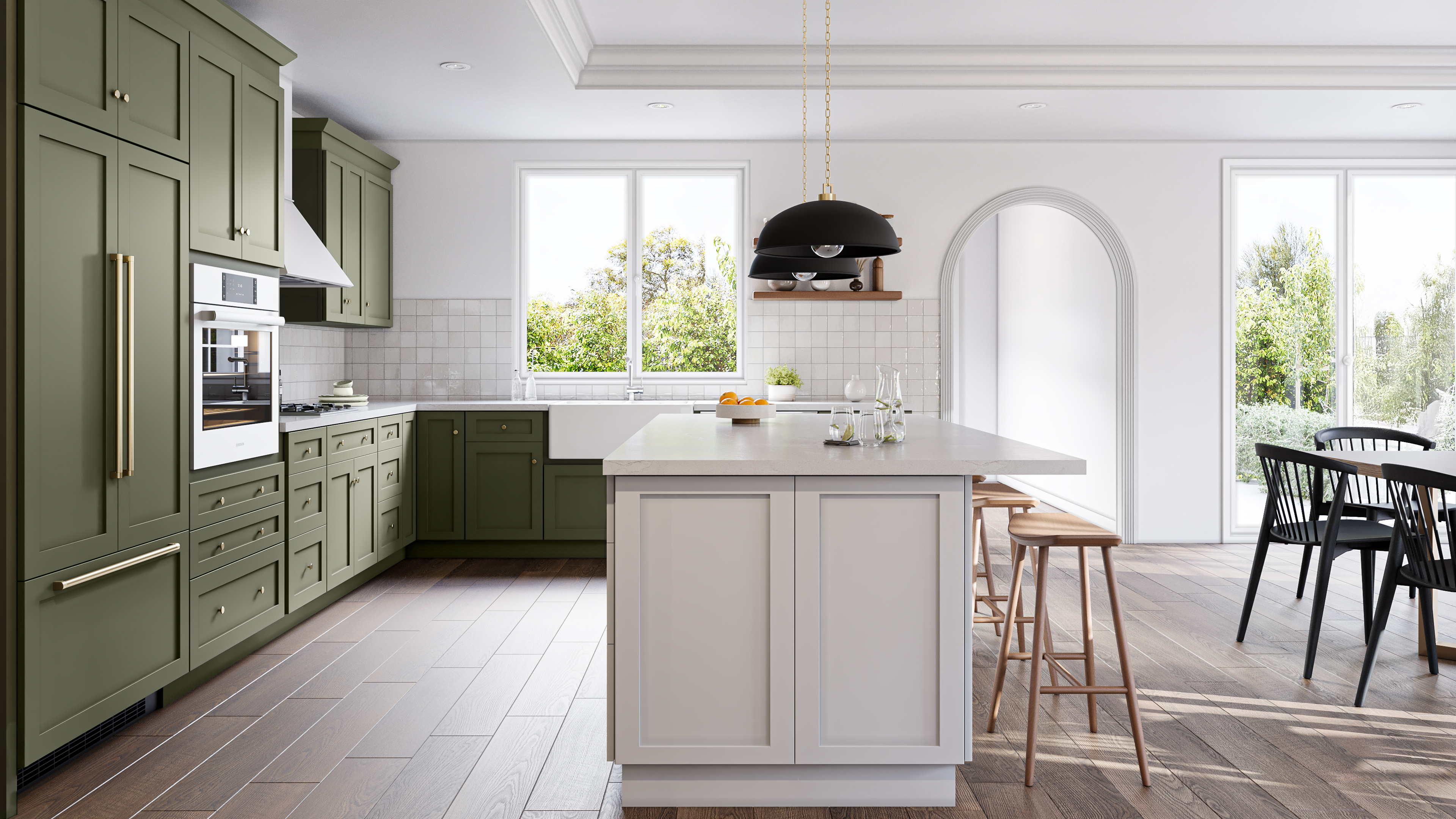 The Allure Galaxy collection serves as the ultimate canvas for self-expression, blending the structural strength of a wide-rail shaker with a palette that ranges from the ethereal to the earthy. In these featured spaces, we explore the dramatic tension between the organic soul of Desert Oak and the deep, botanical mystery of Forest Green. By pairing these rich tones with crisp White islands, we’ve created a gravitational center in the home where timeless geometry meets contemporary, high-impact light.We’ve taken the classic shaker and given it a world of color to orbit.